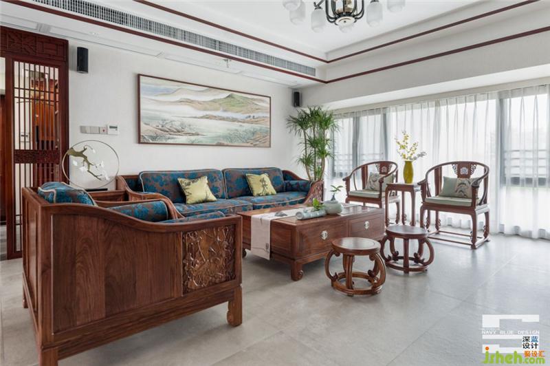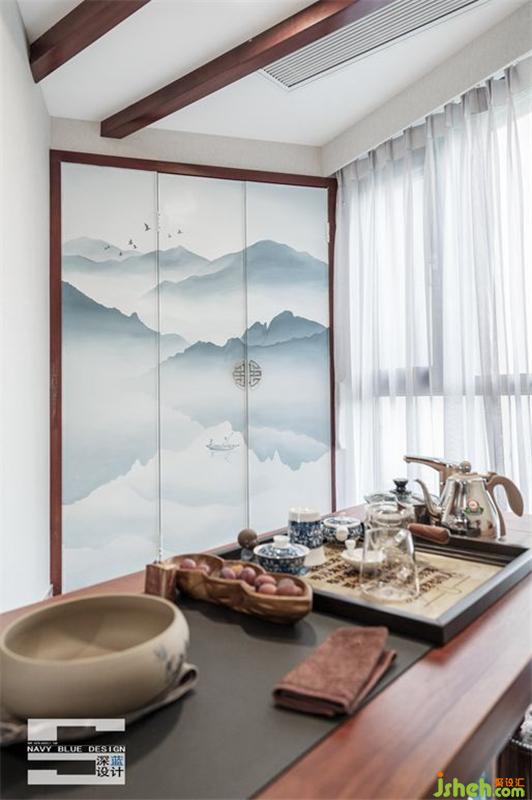 色彩上與整個(gè)空間保持一致,深棕木色的茶幾、天花格柵、置物柜,穩(wěn)重而不失韻味;天青色的山水畫(huà)設(shè)置成雜物間的折疊門(mén),營(yíng)造一種“千山鳥(niǎo)飛絕,萬(wàn)徑人蹤滅”的意境,安靜、放空思想、不被外界打擾。