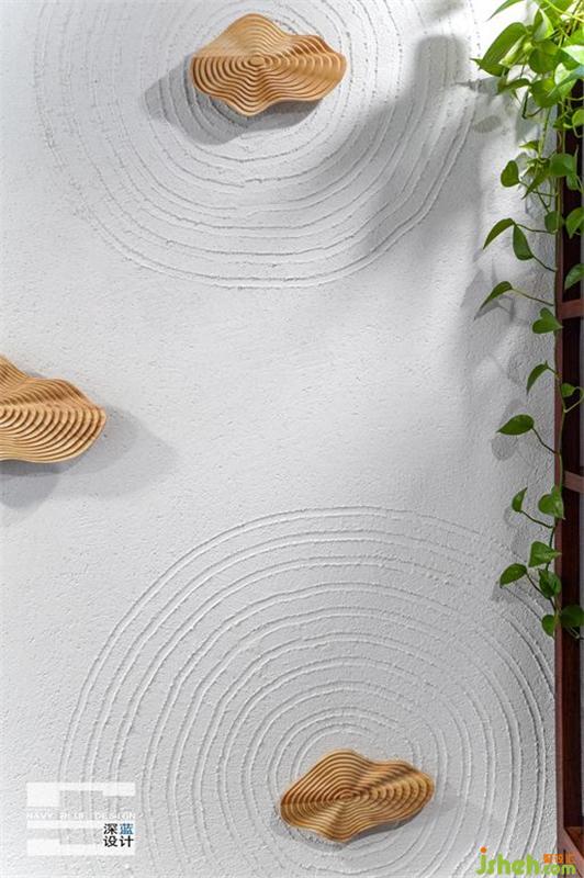 茶室最大的亮點(diǎn)要數(shù)背景墻,利用灰泥做成的小漩渦,搭配實(shí)木旋渦墻飾,就像水滴掉進(jìn)水里形成的漣漪,與對(duì)面的天青色山水畫(huà)折疊門(mén)相呼應(yīng),靜態(tài)結(jié)合,使茶室不過(guò)于沉悶。