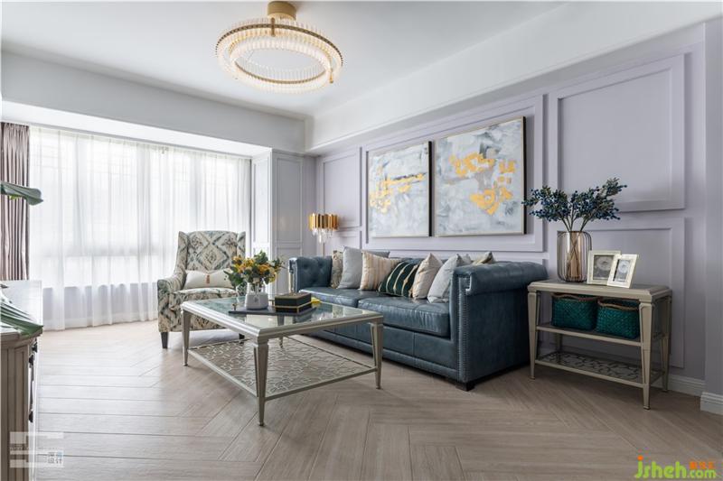 客廳猶如鋪滿懷舊的音符。使用大量的仿舊工藝木飾面,如地板、護(hù)墻板、電視柜、茶幾等,線條流暢,散發(fā)著濃郁的美式風(fēng)情;沙發(fā)背景墻采用鑲嵌裝飾手法,并飾以淺紫色油漆和線條淺浮雕;整體色調(diào)柔和,淺紫色、復(fù)古藍(lán)、金色、原木色,空間懷舊而浪漫。