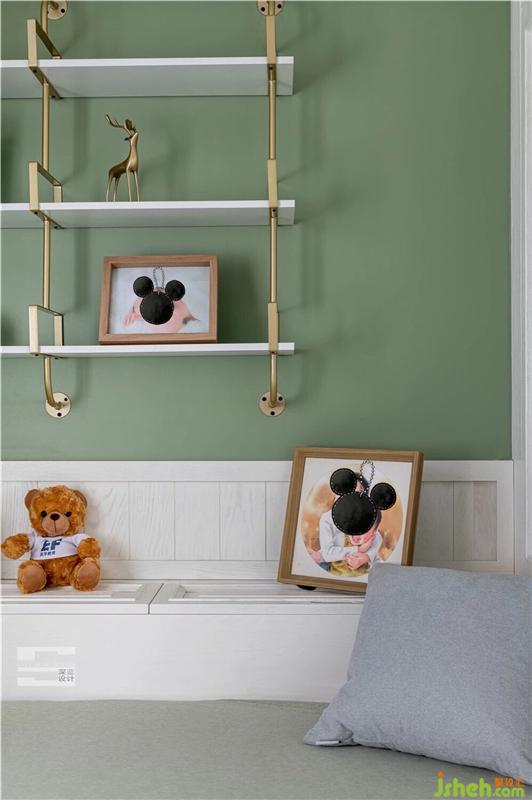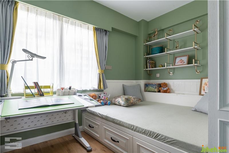 次臥是兒童房,定制的柔和綠色連體書柜書桌組合,造型就像美式小木房子,風(fēng)格簡(jiǎn)潔,卻實(shí)用性非常強(qiáng),即可以收納,也可以當(dāng)展示柜使用。