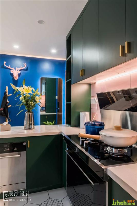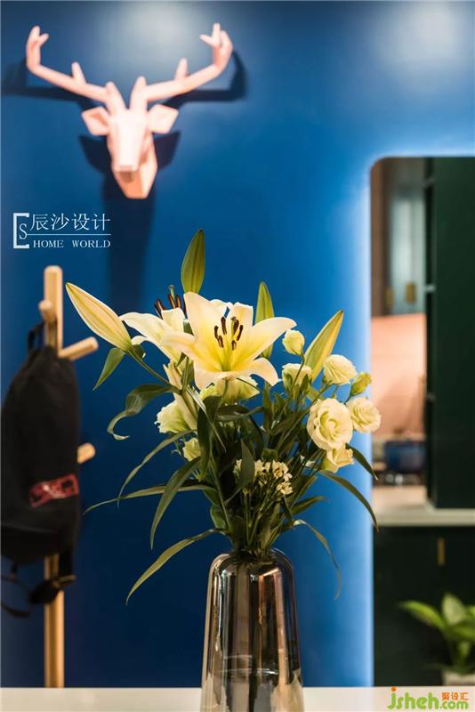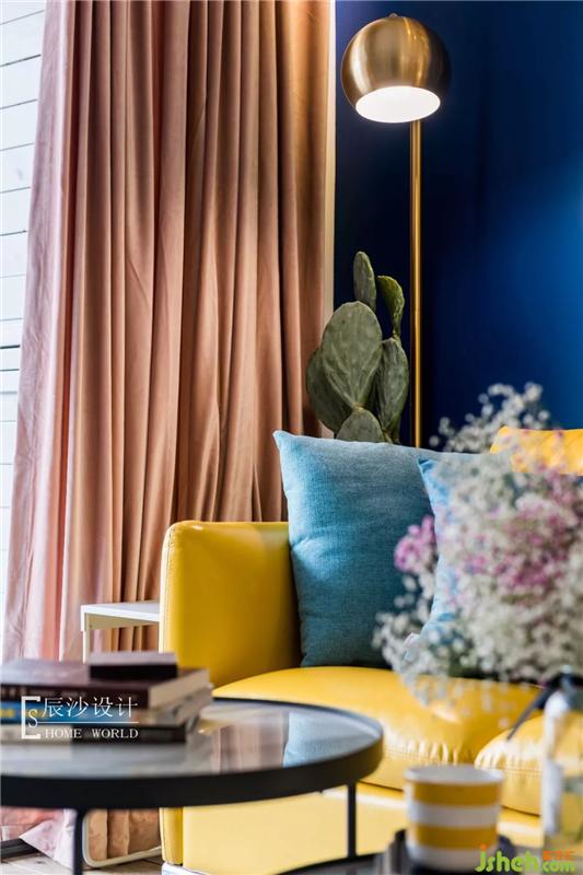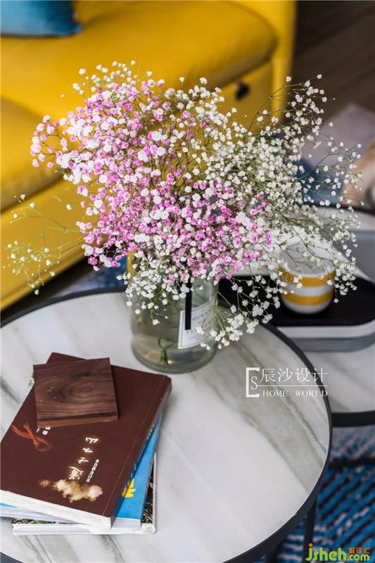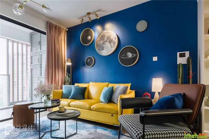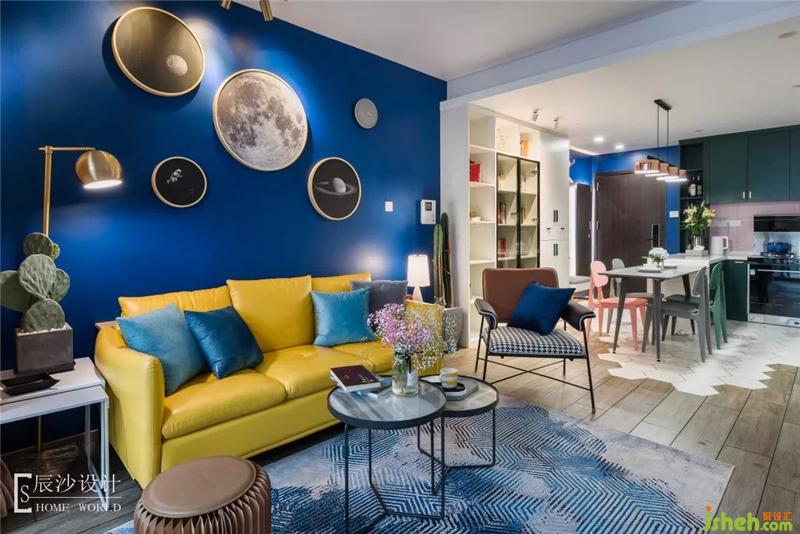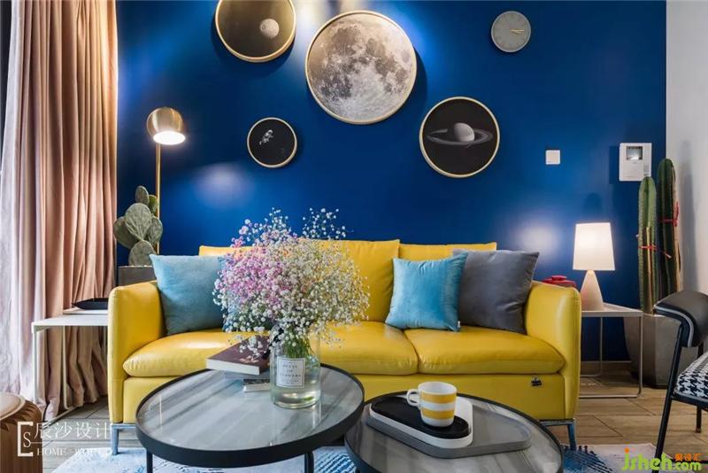 客廳在色彩上主要運用藍色和黃色,靜謐之中又有點活潑氣氛,配合藍色墻漆搭配的金色邊框星球掛畫,讓整個空間充滿藝術氣息,仿佛遨游在小王子太空中,尋找著屬于自己的那份童真。室內(nèi)設計師