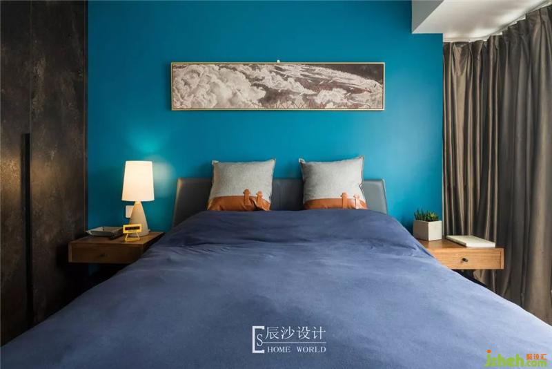 臥室在色彩上延續(xù)客廳的靜謐格調(diào),藍色的墻漆配合原木色床頭柜,加入棕褐色的儲物柜,裝著綠色竹芋的紙質(zhì)感花瓶,散發(fā)出安穩(wěn)的氣氛。