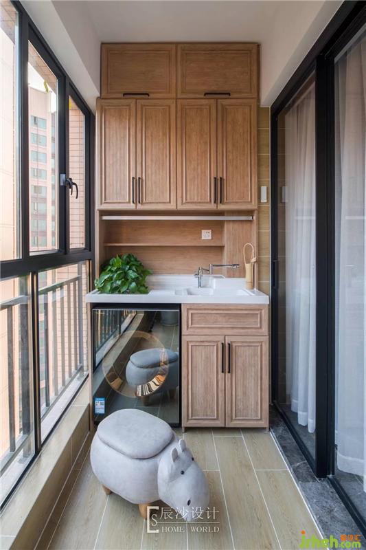 一體式的吊柜設(shè)計(jì),充分地利用了陽(yáng)臺(tái)的空間,原木色調(diào)柜子和木紋地磚相配,小盆栽的肆意點(diǎn)綴,都使露臺(tái)成為了享受舒適愜意居家氛圍的最佳場(chǎng)所。室內(nèi)設(shè)計(jì)師