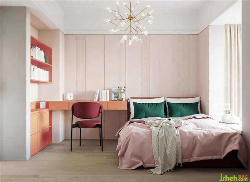 The second bedroom with pink as the background color gives people an elegant and soft feeling. Using the advantages of the house type, we design a wall type bookcase, and extend it to the bedside in the form of a desk. It saves space and increasing space storage.