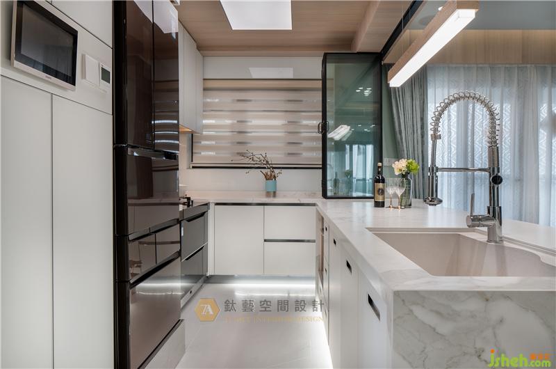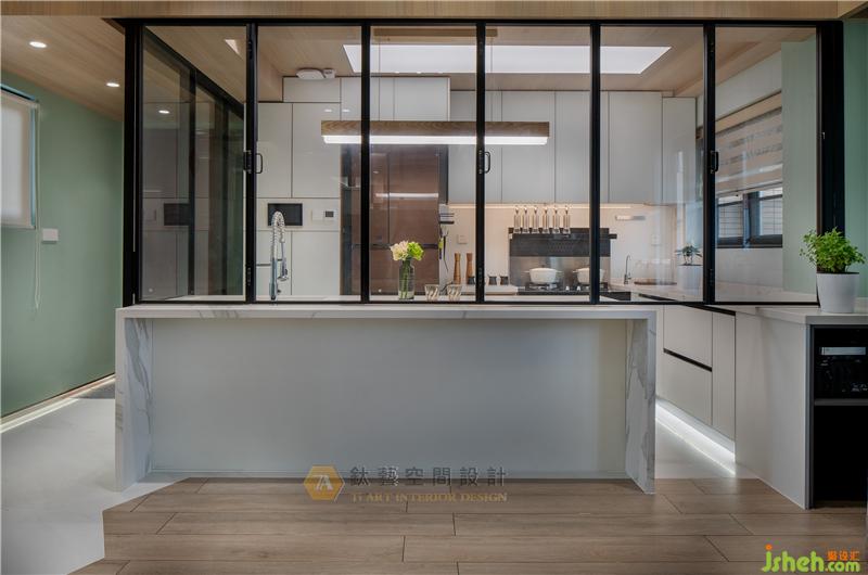 廚房趟門軌道與吊頂有秩序的結(jié)合,同一空間內(nèi)收放自由轉(zhuǎn)換,可封閉、可開放,實現(xiàn)空間的靈活多變性??臻g的相互流通與連接也將生活的重心擴散到整個住家空間。