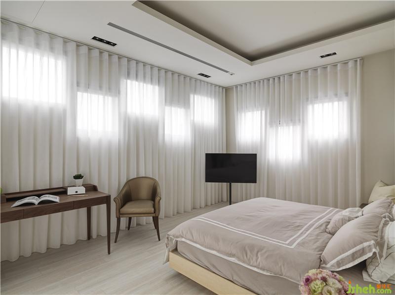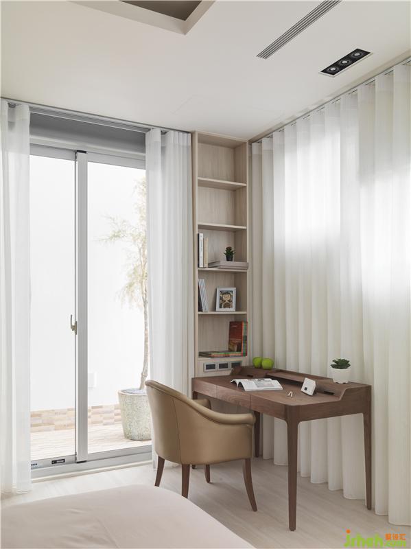三樓別墅設(shè)計,臥室以清爽舒適的淺暖色調(diào),營造舒心的睡眠環(huán)境。同樣以玻璃窗打造穿透性效果,使自然光線進(jìn)入居家空間。