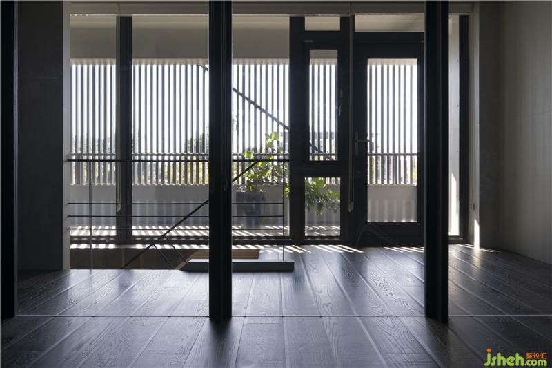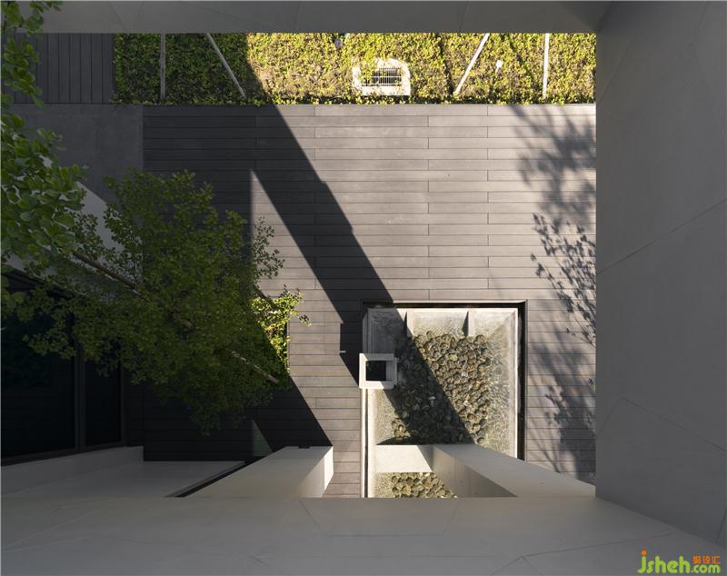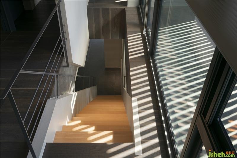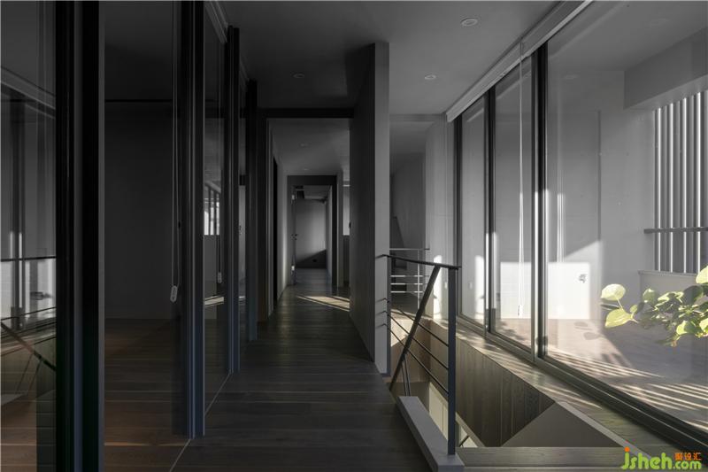 建筑之內,深色系的地磚與灰白墻面形成強烈對比,深沉冷靜的格調,即便沒有華貴之物襯托,也盡顯主人的莊重個性和氣質非凡。抬高的廊道貫穿整個空間,由客廳起始一直延伸至西廚,加強了空間立體感。