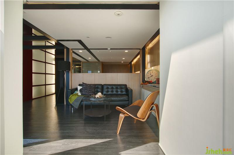 由大門(mén)進(jìn)入,設(shè)計(jì)師將入口的第一個(gè)空間規(guī)劃為接待區(qū),摒棄華而不實(shí)的招待前臺(tái),以另一種新的形式規(guī)劃空間,打破以往傳統(tǒng)固有思維,讓空間得到合理的分配。設(shè)計(jì)師藉由與廊道交錯(cuò)的空間,將其匯入到接待空間之中,讓空間得到擴(kuò)大,而沙發(fā)后的半高木飾面隔墻,則讓人在步入空間時(shí),不會(huì)有視線的阻隔,讓視線得到延伸,擴(kuò)大了空間感受。
