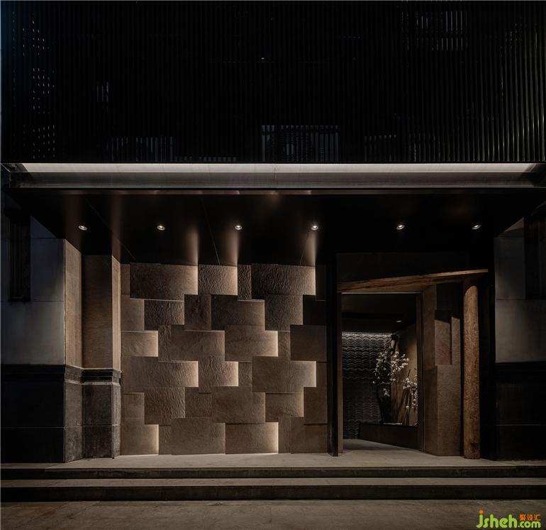 主要材料:巖片、碳化木、水波紋不銹鋼板、木飾面、夯土