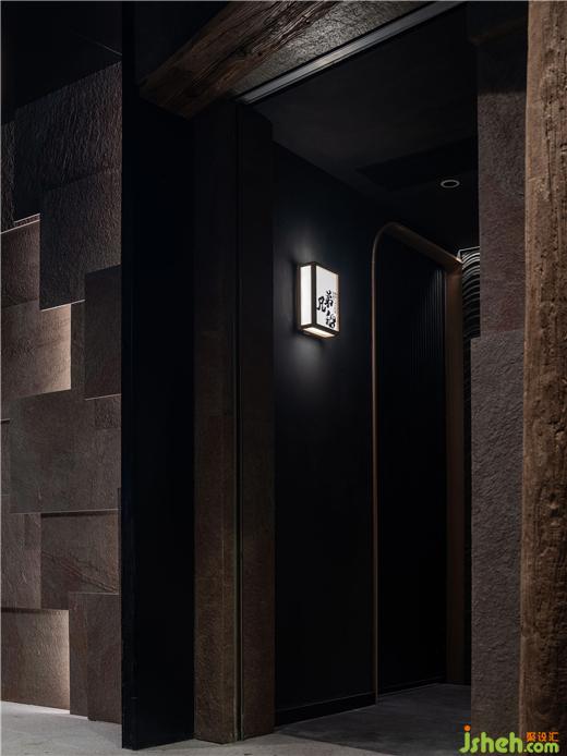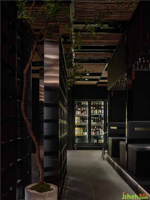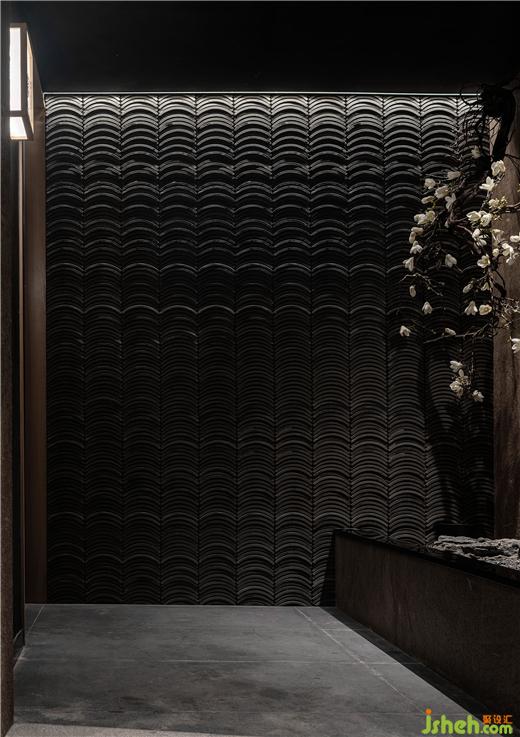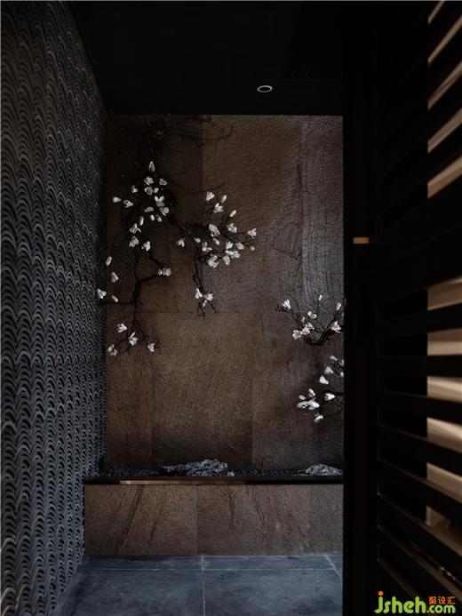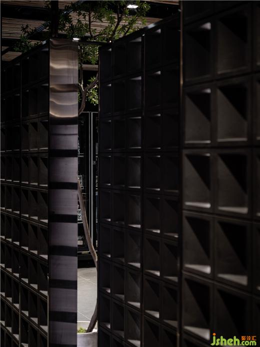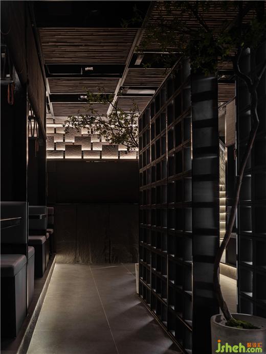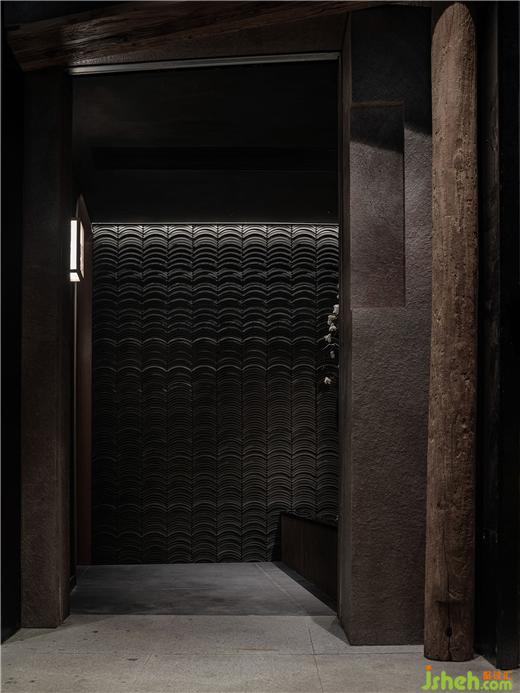 入口隱秘而低調(diào),無招牌設(shè)計別具一格。日料餐廳設(shè)計拒絕平凡的立面表達(dá),相互交疊的巖板錯位分布,雕塑感的光影猶如鯉魚鱗片栩栩如生,塑造印象深刻的感官體驗。擇老榆木樹干作門頭立柱,古樸的瓦片元素運用現(xiàn)代手法重復(fù)疊加,日式傳統(tǒng)精粹融合現(xiàn)代設(shè)計精神,守拙出新。兩株玉蘭慵懶的攀緣在肌理感豐富的墻面上,東方美呼之欲出。微弱的間接光源融入氤氳的夜色中,引領(lǐng)食客暫別喧囂,放松身心,體會慢生活格調(diào)。