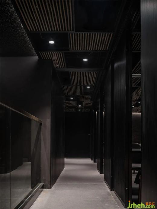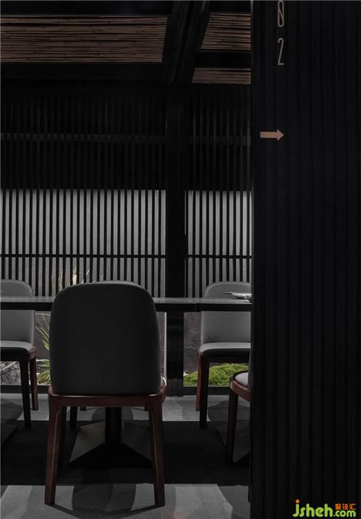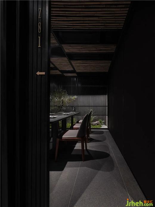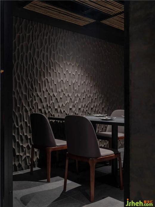 樓梯間墻面選用原始碳化木,經(jīng)過不規(guī)則的幾何圖形排列,增強(qiáng)了空間的趣味性。踏階與樓梯扶手處的燈帶,作為視覺方向的指引。日料餐廳設(shè)計細(xì)竹材質(zhì)錯落有秩地嵌入天花,深灰色夯土與碳化木材質(zhì)的墻面,讓人置身于沉靜純粹的氛圍之中。