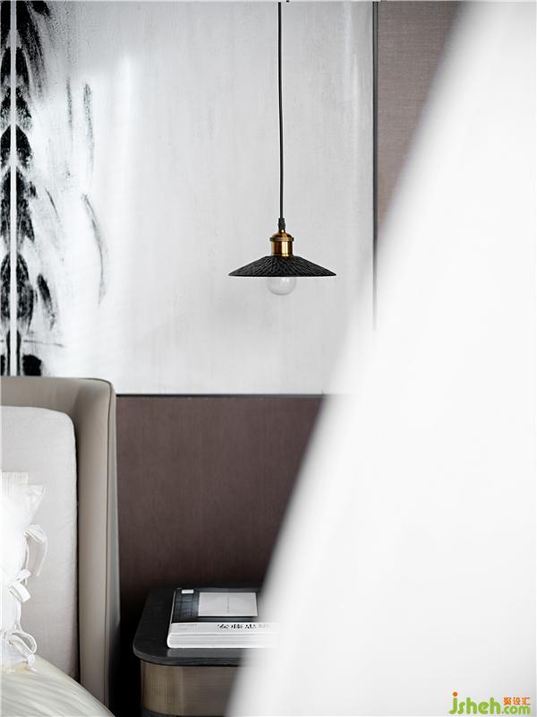 主臥依舊延續(xù)直線條的空間動線,棕木地板與米白麻質(zhì)的墻面結(jié)合,床頭的日式手繪帛畫將空間層次感巧妙勾勒。起居生活與窗外自然的呼應(yīng),讓凈、簡、素的基底更具活力與生機。