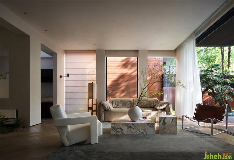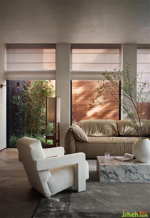 再往前便來到與室內(nèi)無縫連接的大花園,打開大扇推門,迎著下午的暖陽和微風(fēng),室外的大片綠意肆意流入室內(nèi),讓身體完全放松下來,享受或獨處或朋友家人聚會的愜意時光。居所和空間之間的關(guān)聯(lián)是一處又一處的小自然,內(nèi)心生活就從這里開始,家的生動也從這里開始。