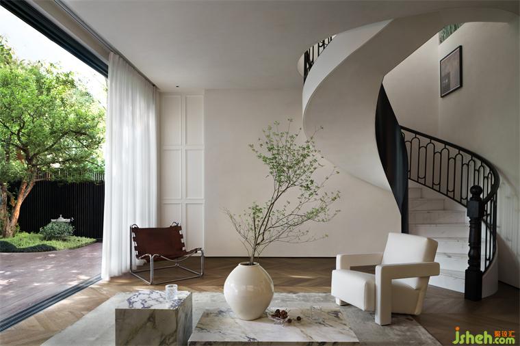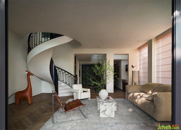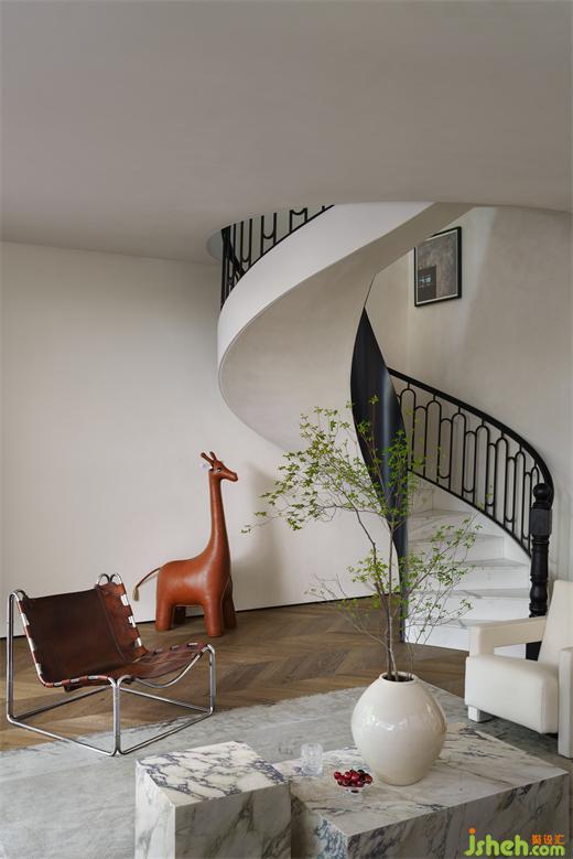 成都別墅設(shè)計師將一個原結(jié)構(gòu)二層直跑樓梯分解成直跑和旋轉(zhuǎn)樓梯,不僅將光線最大限度的引入室內(nèi),解決負(fù)一層采光弱的痛點,加強空氣的流動,同時,旋轉(zhuǎn)的曲線也為一層生活空間創(chuàng)造了某種律動,空間變得更為自由和生動。不論是自己家人在此活動,還是會客待友,都充盈著舒緩流動的氛圍。