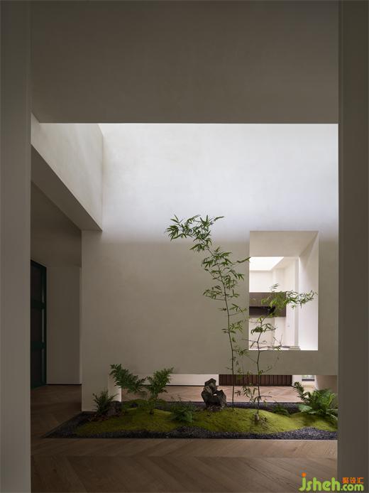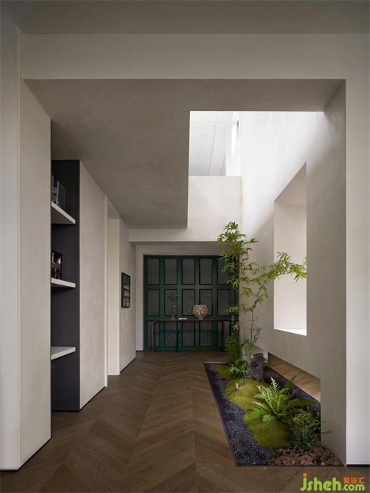 目光順著天井往下看落到地面上,是設(shè)計師營造的一處室內(nèi)的小自然,石頭、青苔、高矮錯落的植物,為兩條過道帶來了靈動的氣息。天井外的自然光灑下來,迎接它們的正是這一片地面青綠。