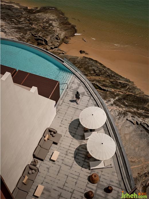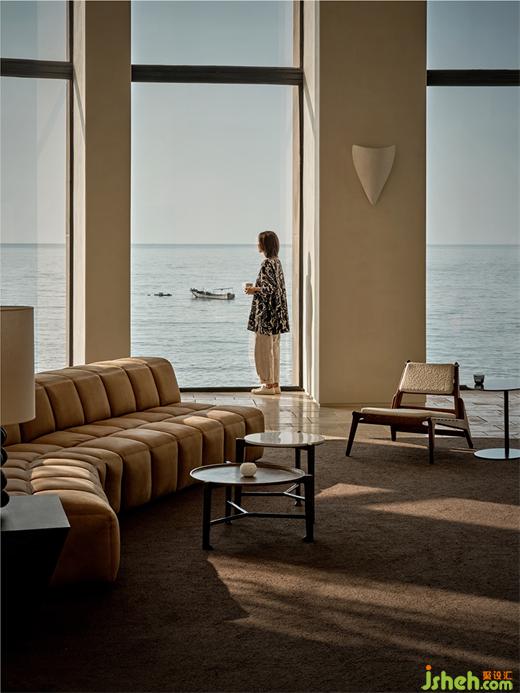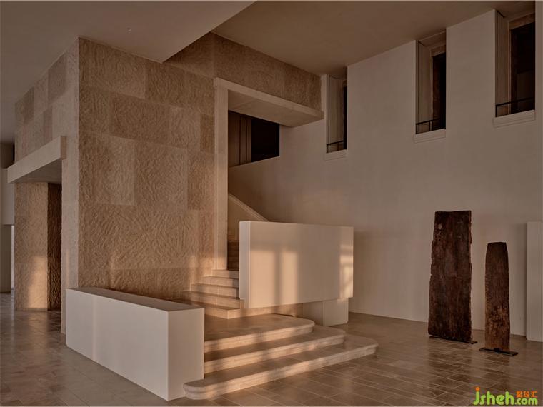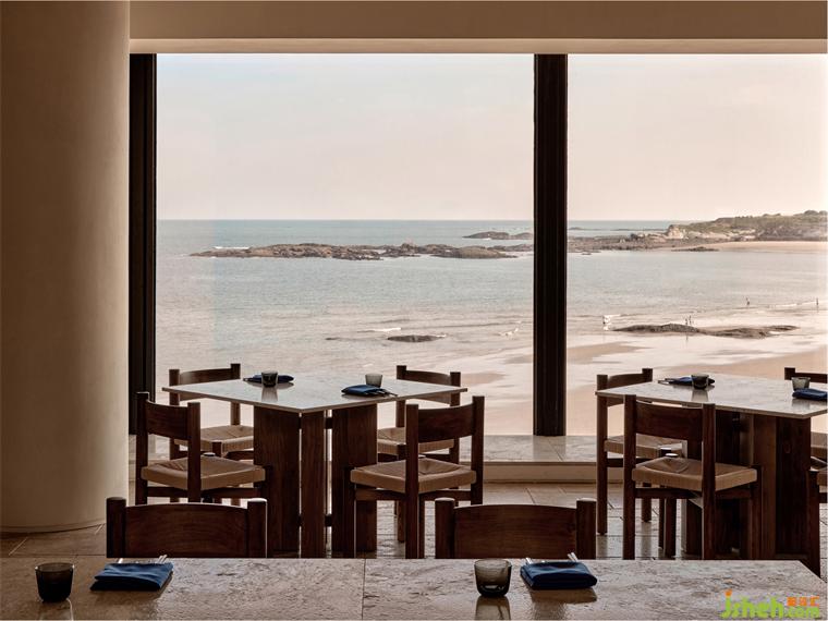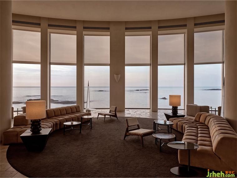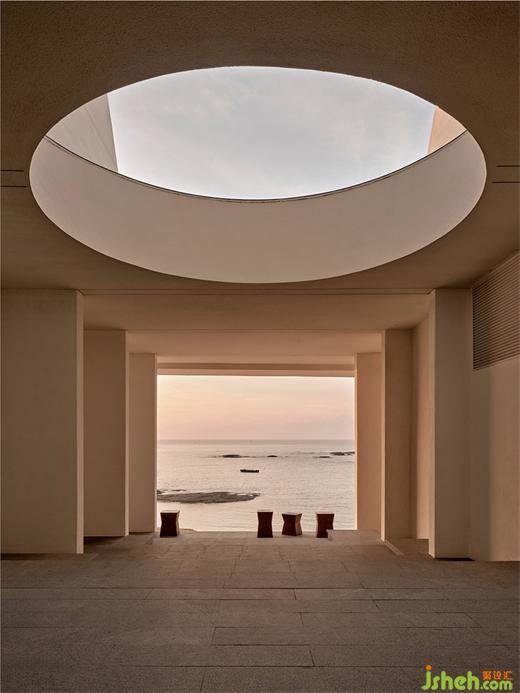 我們從入戶開始重新建立空間秩序,酒店設(shè)計(jì)將臺階打磨成與礁石共生融合的形態(tài),留出自然框景的“海天一色”作為前奏。并于整個(gè)空間的色彩、光影中呈現(xiàn)自然的節(jié)奏感,不同于室外的海天遼闊,進(jìn)入大堂,干凈利落的游廊以柱石的序列、米灰的色調(diào)和靜謐的燭光來屏蔽嘈雜的干擾,配合大量的留白空間。