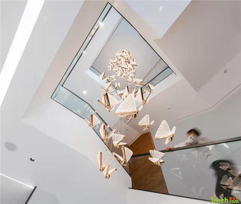 樓梯間由蝴蝶藝術燈飾構建了一幅蝴蝶飛舞的情景,廣州別墅設計讓人感覺溫暖、而富有生活情趣,兩只蝴蝶的飛行軌跡交織成一個圓,寓意圓滿,是對美好的向往與追求。