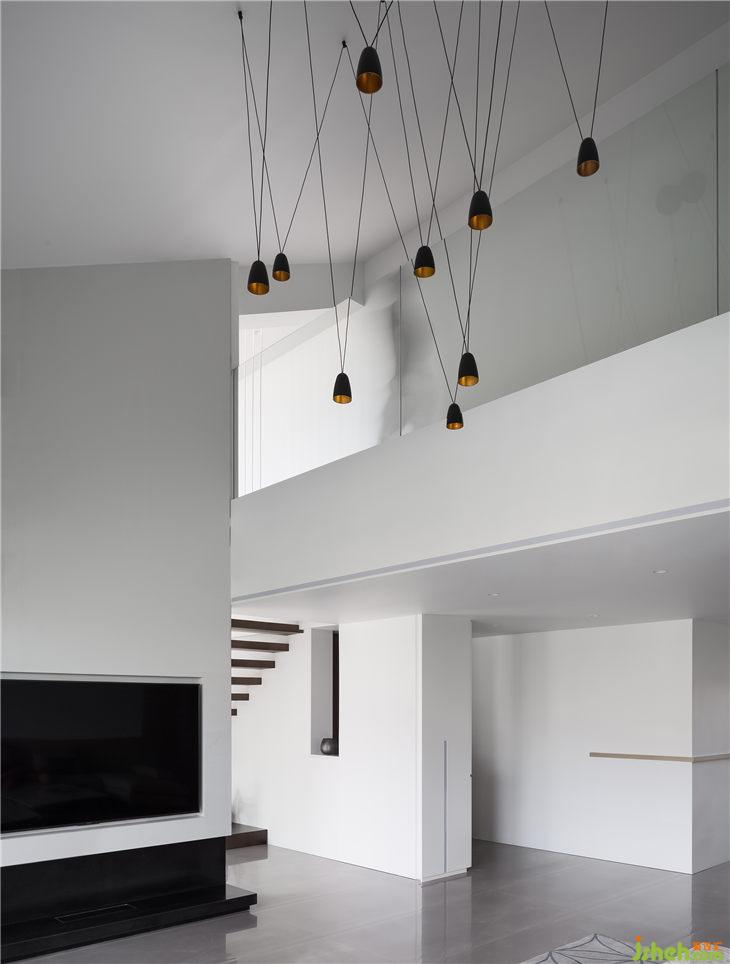 在整體的結(jié)構(gòu)設(shè)計上,為了讓建筑的形式感可以延伸到一樓,我們打開了二層的樓板,客廳挑高空間的同時解決了二層采光及通風(fēng)的問題,一層我們定義為起居生活的行為,結(jié)合他們的職業(yè)習(xí)慣,我們?yōu)樗麄冊O(shè)置了單獨的更衣室以及入口的行李箱擺放柜。二層定義為是娛樂休閑的行為,同時設(shè)置了休息室,使深夜回家不影響對方休息。從設(shè)計上有力的去解決他們的生活規(guī)律問題。