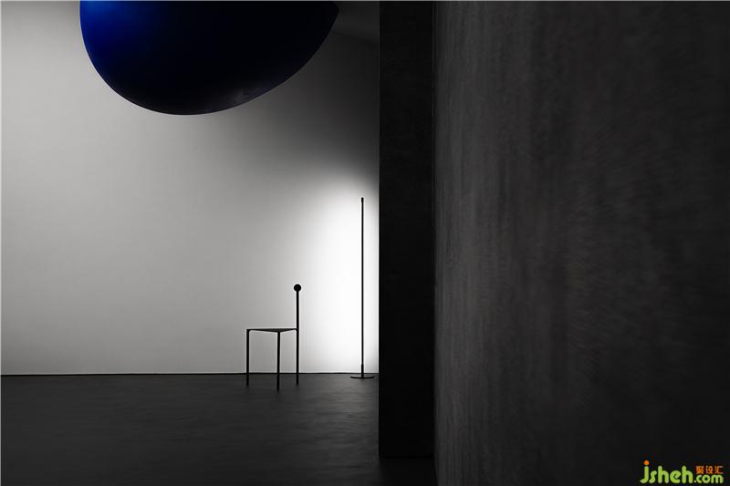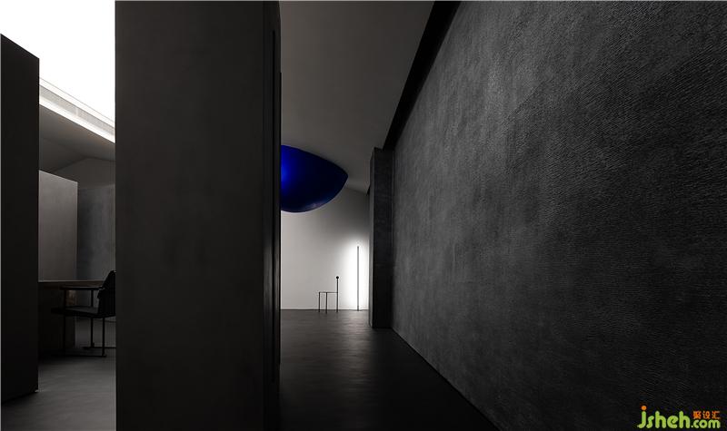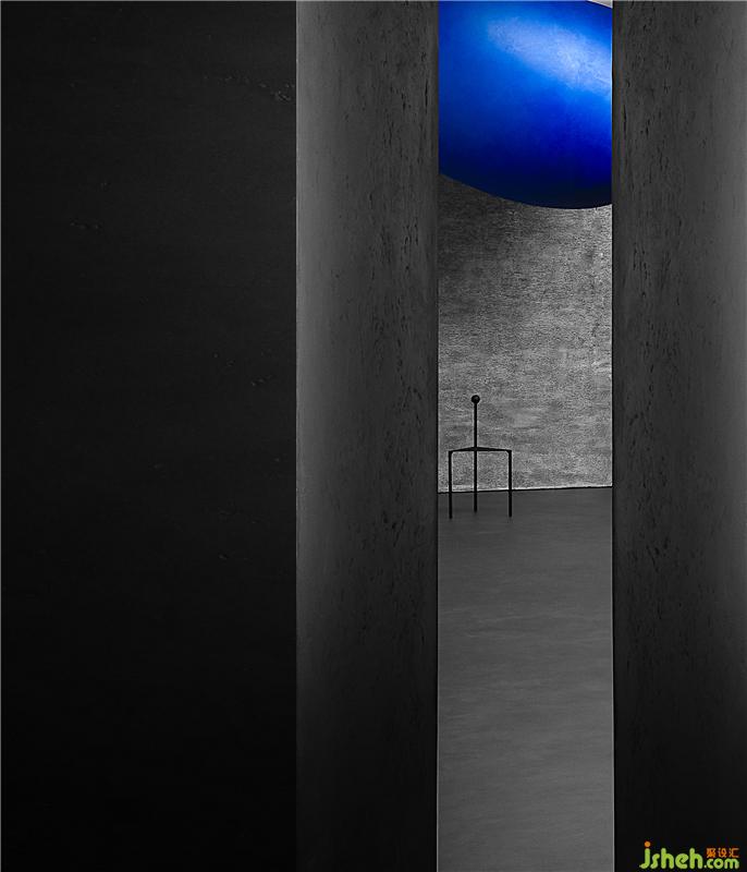 空間通過球體劃分了一個彈性的空間,這個場域人是空間的主體,沒有被圍合卻擁有最強場所感的區(qū)域,一個人與空間能交流的場所,自由的空間。裝修設(shè)計采用藍色,并與前臺的藍色相互平衡,讓兩者有一種孤獨的對話的情緒。用嚴謹?shù)膸缀沃刃騺順?gòu)建感性的場域,矛盾與協(xié)調(diào)的構(gòu)筑。