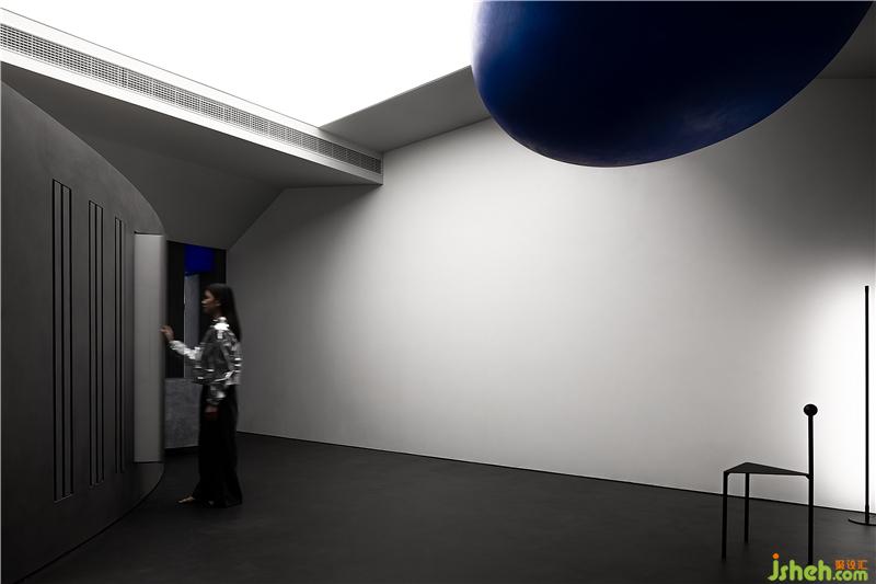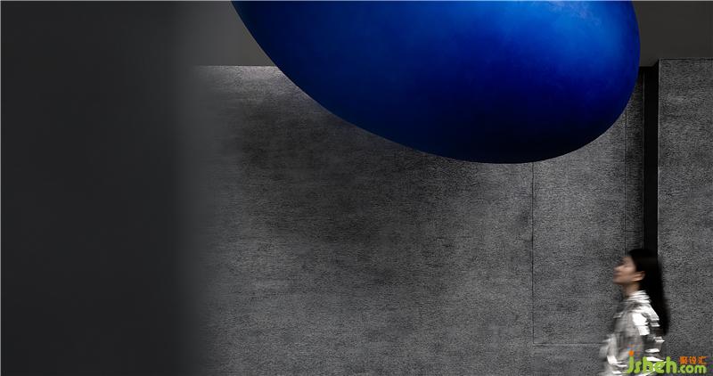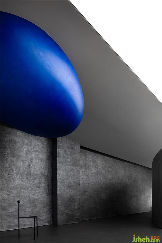 有計劃的將空間轉(zhuǎn)折的入口尺度縮小,提示你進入不同情緒與味道的世界,小的口會讓你對后面的事情產(chǎn)生興趣與想象力,藍色的小巨蛋形幾何體從天而降,與平面的曲線相呼應(yīng),且產(chǎn)生強烈的力量感。