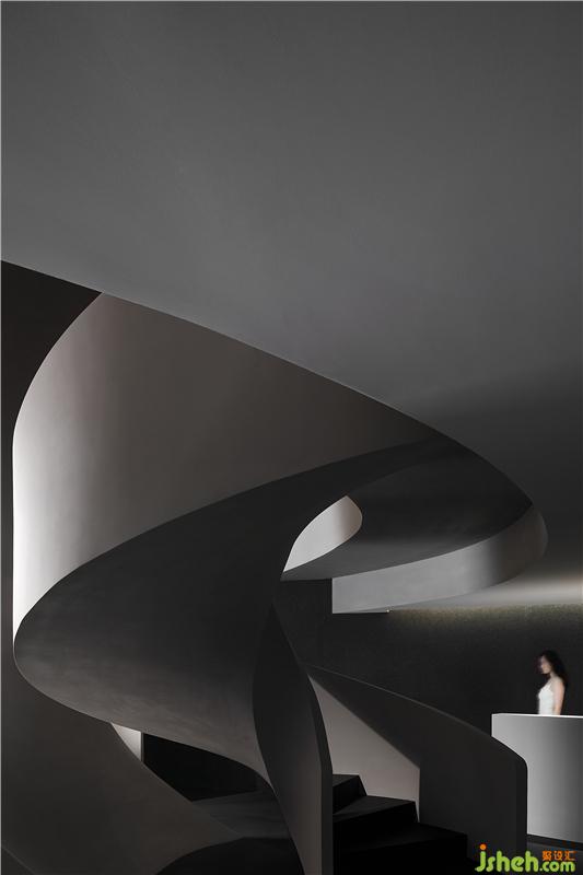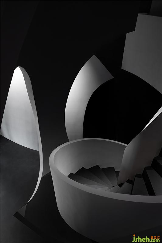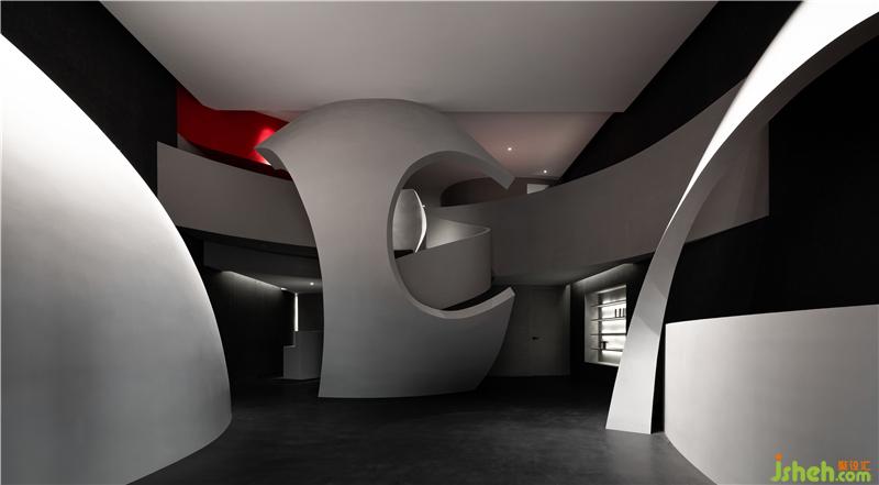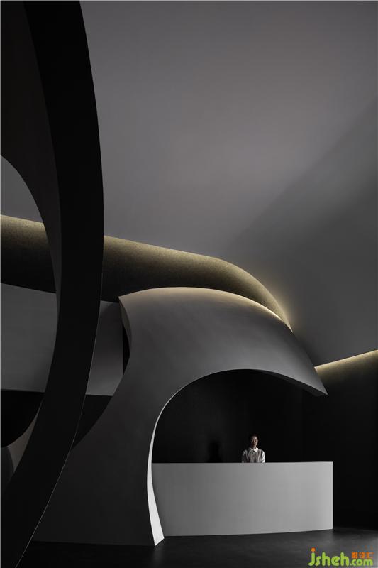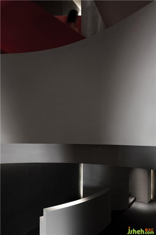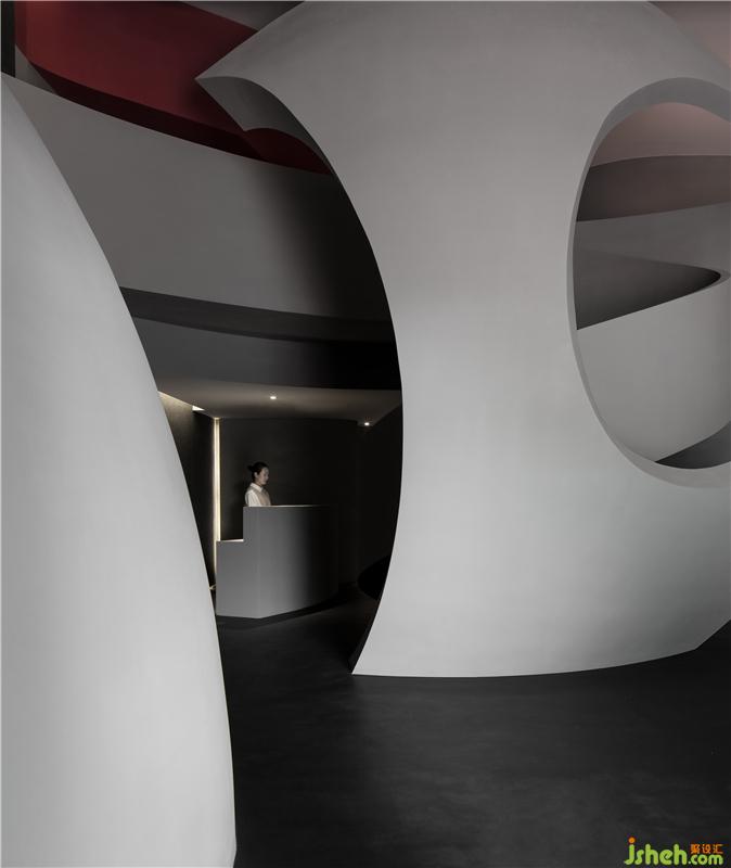 進入空間,曲線與直線的組合架構大型的幾何體量,厲冷的混凝土協(xié)作塑造強烈的沖擊感。視覺上線條的延伸交織,內含人體細胞流動的本質,當進入者緩緩而行,靜與動的相對情境才開始發(fā)揮作用。