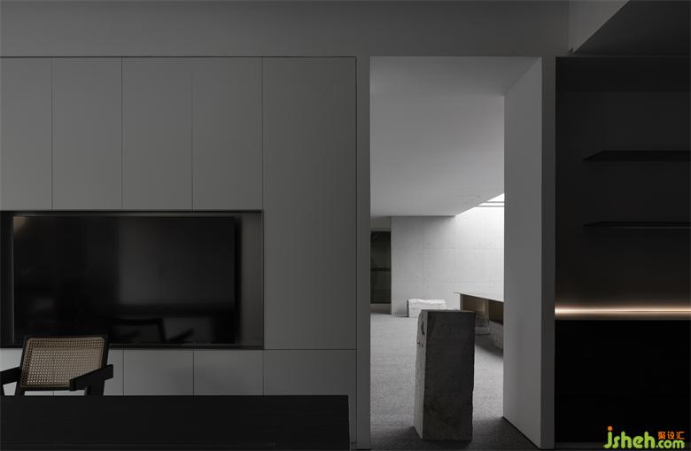 空間的中心由兩大部分組成,產(chǎn)品展示位于進(jìn)入空間的左側(cè),簡(jiǎn)單中強(qiáng)調(diào)秩序,通過(guò)產(chǎn)品展示來(lái)強(qiáng)調(diào)空間的序列感,強(qiáng)調(diào)產(chǎn)品的美學(xué)理念。不銹鋼與自然石頭的展示臺(tái),初步訴說(shuō)到了產(chǎn)品定制的核心理念,右側(cè)為辦公區(qū),簡(jiǎn)潔的辦公功能搭配背面木飾面活動(dòng)樣板展示,簡(jiǎn)潔大氣。