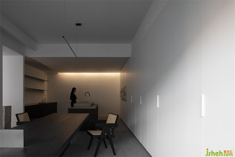 進(jìn)入空間的第三個(gè)部分既是接待區(qū),空間立面是柜體的展示,雖然空間較小,卻將廚房系統(tǒng)、衣柜系統(tǒng)、酒柜系統(tǒng)、鞋柜系統(tǒng)以一種統(tǒng)一協(xié)調(diào)的方式一一陳列展示出來(lái)。展廳設(shè)計(jì)空間的中心是一張定制的接待臺(tái),是一個(gè)拉近人與人之間細(xì)膩關(guān)系的中心,這是一個(gè)私密與舒適的過(guò)程。