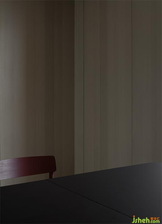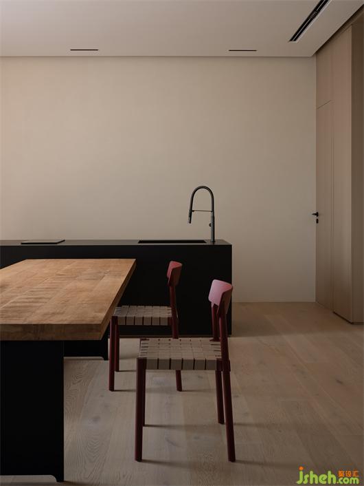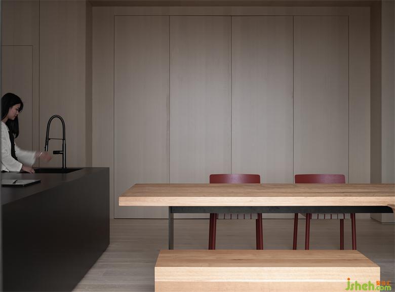 The overall interior design of the residence emphasizes simplicity and comfort. The floor of theliving room and thedining roomare covered withwhite marbles, whichshow simplicity.Walls are clad in large areas ofmilky-white art paint and warm-color wooden veneers, to produce cleanness andthewarm tone of the space. The red glass of the kitchenis ahighlightin thespace,echoing with theredfurniture andredexterior walls, and also giving a sense of comfort and dramatic visual effects. The transparent glass windows on the building facades create harmonious integration between the interiorand thesurrounding outdoorenvironment.In addition, wooden veneers and wooden flooring divide the space into two "boxes"clearly. Theprivacy of the space is enhanced from thepassage.