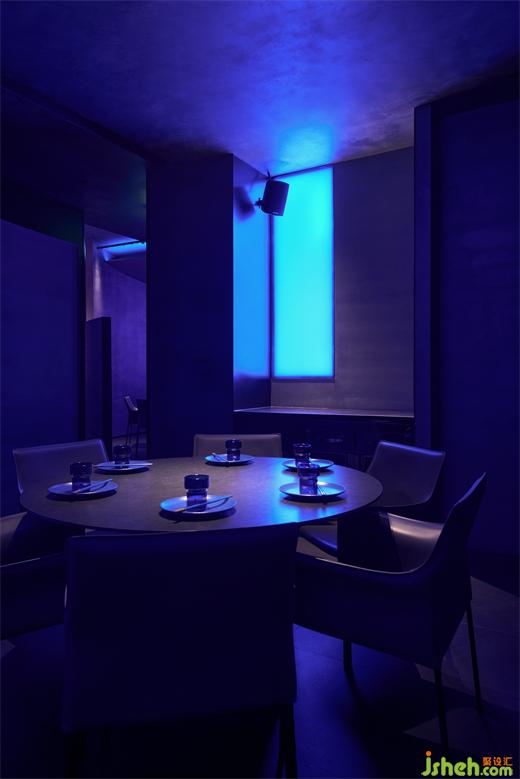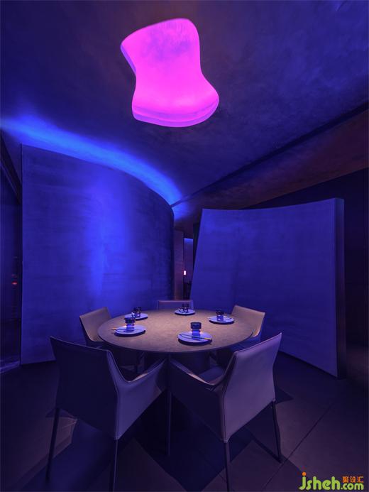 The curved screen walls function as partitions, which demarcate several independent socializing and dining areas. Their dramatic, powerful forms along with the cool lights create a dreamy ambience and convey the brand's avant-garde image as well.
