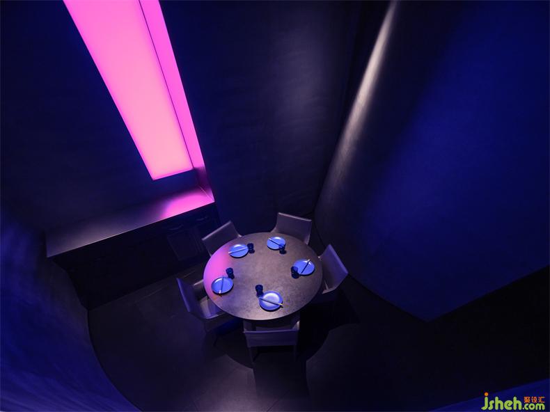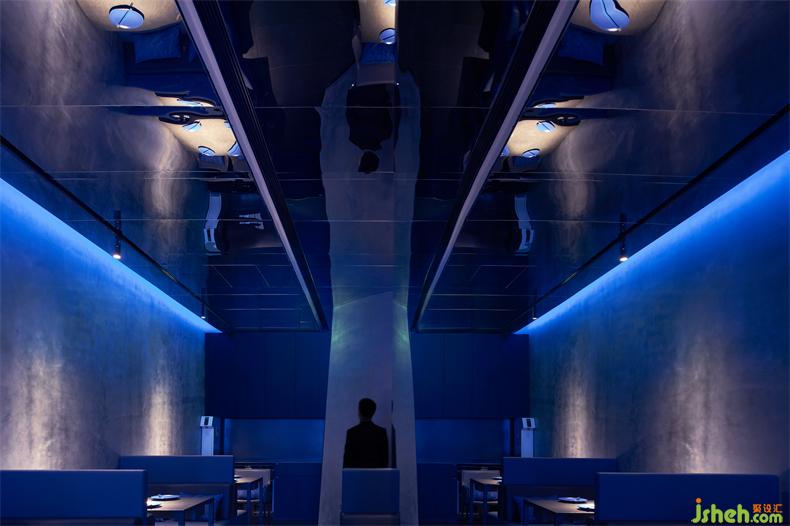 迷幻波長的冷調(diào)藍(lán)光隱現(xiàn)在充滿險(xiǎn)象的體塊情境中,藝術(shù)餐廳設(shè)計(jì)微妙的光影讓空間帶來喘息和微醺曖昧的情愫,對比反差的玫紅色霓虹燈光與餐吧空間高度的鏡像,形成強(qiáng)烈的色彩與光影對比,其魅惑的力量,為觀者創(chuàng)造了一個(gè)迷幻體驗(yàn)情境;最終形態(tài)是一種自由的、魔幻的,激進(jìn)的藝術(shù)氛圍。