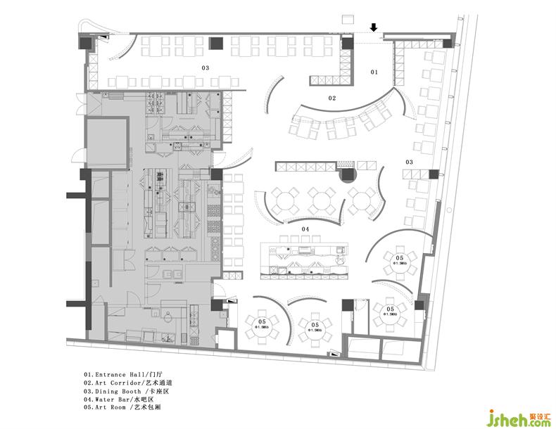 邊沿藝術(shù)包廂區(qū),是設(shè)計(jì)中制造出的用餐儀式感,圍合而又巧妙的透光,其隱秘與矯揉的創(chuàng)作,皆在指引一種相對獨(dú)立與神秘的、窺探式的狀態(tài),半私秘的用餐需求狀態(tài)決定了冷調(diào)的包裹與向里的形態(tài)構(gòu)造。