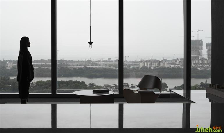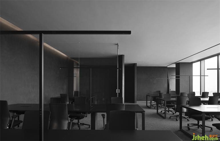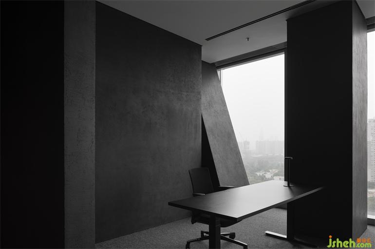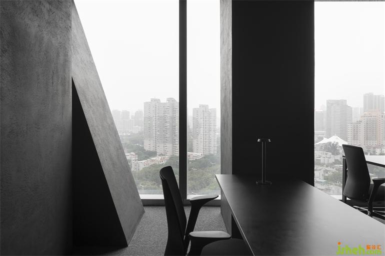 暗黑色系的辦公室,這是一個具有爭議的狀態(tài),另我們驚喜的是,這樣的暗黑系,辦公會所設(shè)計更好地將視覺引到室外的美景,更好的與自然進行互動。簡潔的材料體系,黑色洞石的效仿意大利藝術(shù)漆,體現(xiàn)了空間的份量感,德國芬尼特地毯的運用,強調(diào)了舒適度、吸音及特殊的地面質(zhì)感,不銹鋼與燈光的結(jié)合,強化了空間的科技感與場景感。