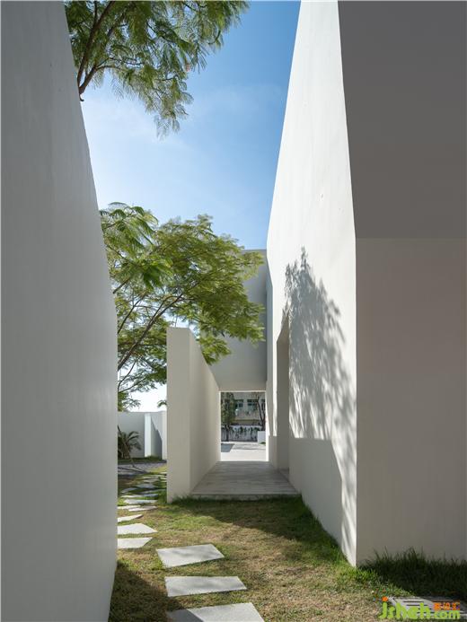 以抽象幾何為基礎(chǔ),艾克建筑又一次極簡(jiǎn)藝術(shù)派設(shè)計(jì)語言的傳達(dá),吸引人們不自覺的想要到處走動(dòng)。內(nèi)庭與外院讓人停留與聚集,傳統(tǒng)的院落用當(dāng)代的形式呈現(xiàn),空間里與外、建筑與環(huán)境、建筑與人都在產(chǎn)生互動(dòng),打造一個(gè)以人為中心的藝術(shù)空間。