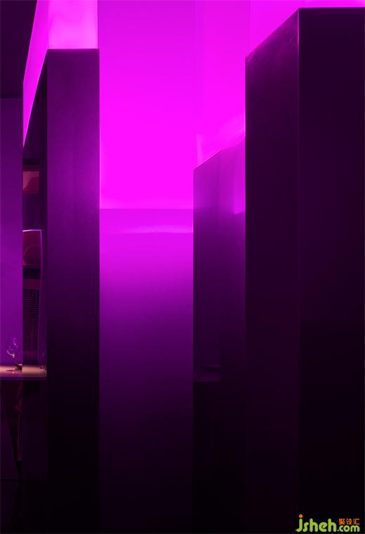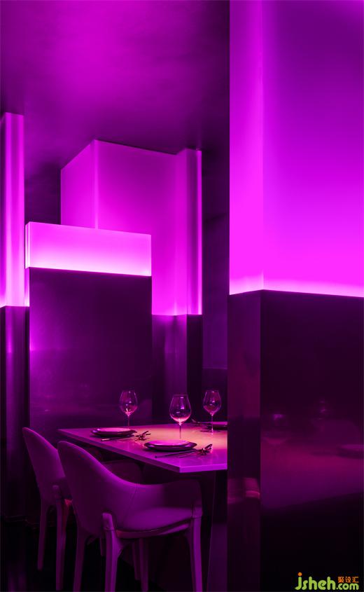 藝術(shù)餐廳設(shè)計(jì)空間通過(guò)畫(huà)面的構(gòu)成和內(nèi)在光色節(jié)奏營(yíng)造出一種冷調(diào)新潮的獨(dú)特氣質(zhì)。理性的墻體與迷離的光圈交界,在人的參與下,產(chǎn)生不同故事的場(chǎng)景感,這種事件性是艾克階段性的嘗試,是一種可度量的空間邏輯。