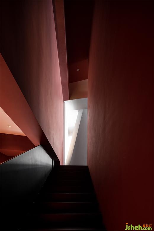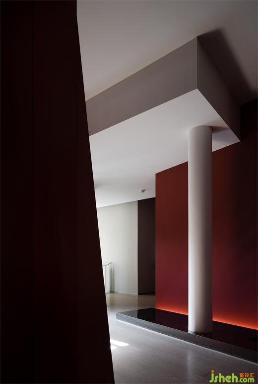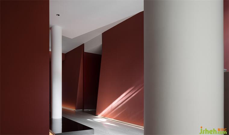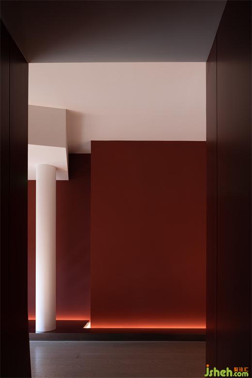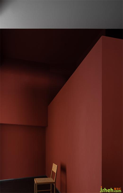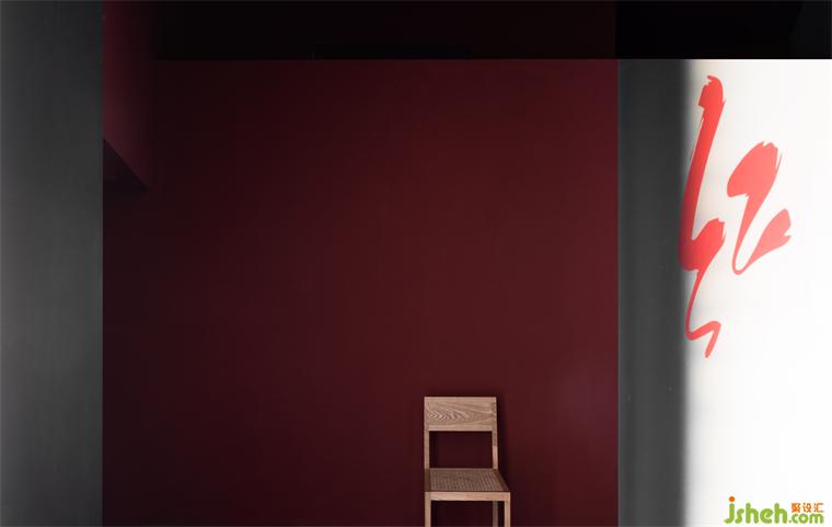 Passing through the winding path, the guests will encounter the restaurant entrance. The space design emphasizes the connection with the outdoor garden landscape and corridor, and creates a strong color contrast with structures as the media. The entrance elongated by the corridor and columns becomes narrow and long, which creates a slow-motion illusion. The hall is defined by red wall coatings and a restrained scale of structures, where the block, plane, line, and lighting are interpreted as geometric expressions from a structuralist perspective to the greatest extent.