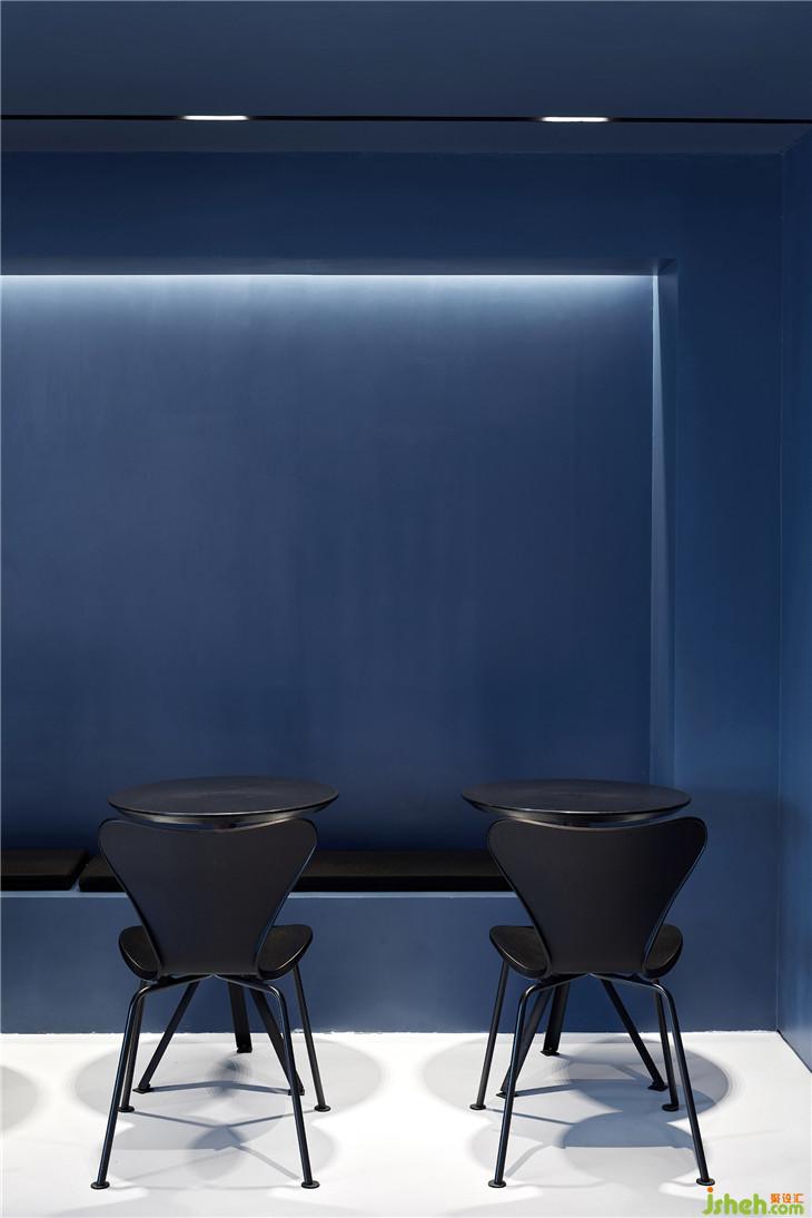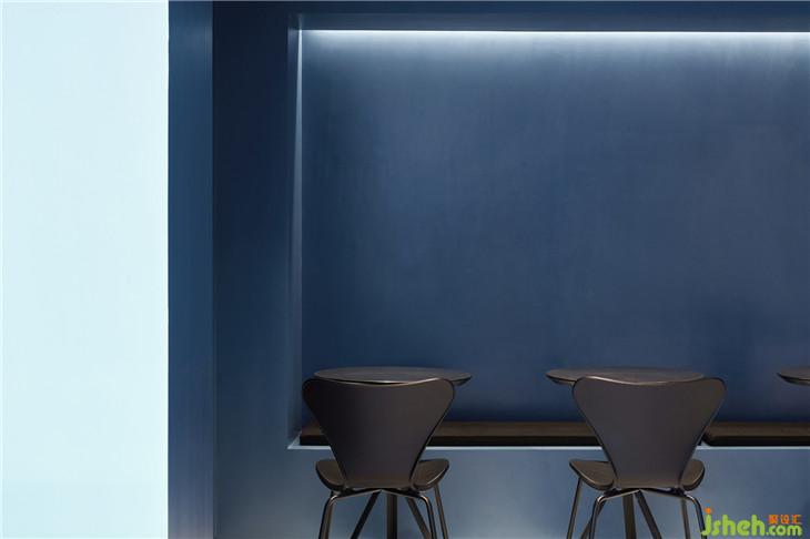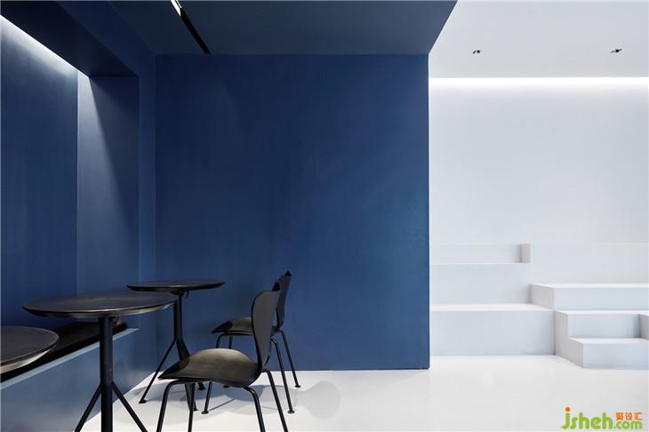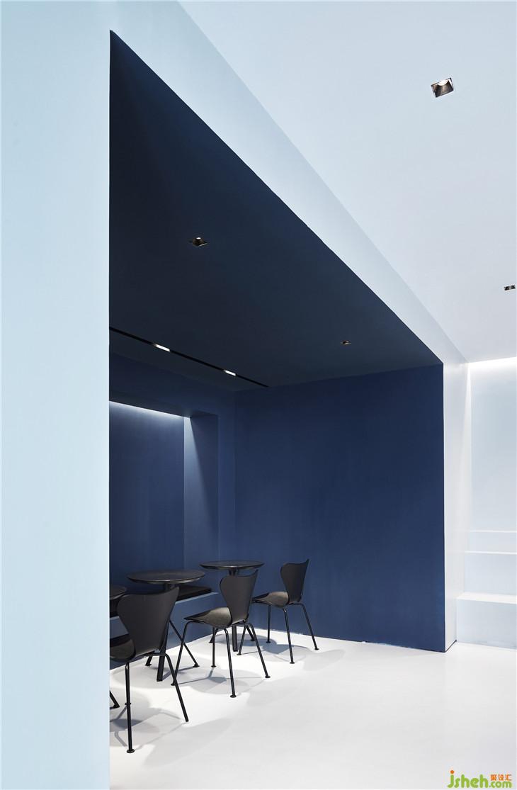 嵌入的藍色空間圍合著靜隅獨處的儀式感,入口區(qū)的大長桌則考慮到多人用餐的互動性。階梯區(qū)的趣味設計既是過渡的灰空間,又為有限的場地容納進更多的功能。一系列的空間操作絲毫不亂,是設計師投入理性分析和藝術感知后得出的最佳解決方案。