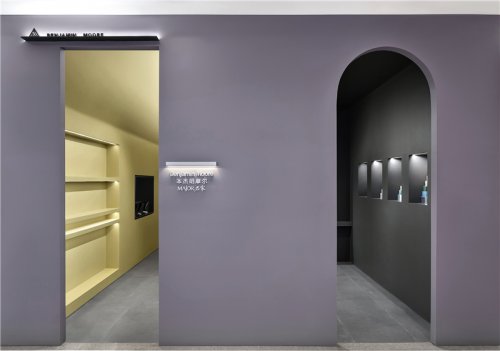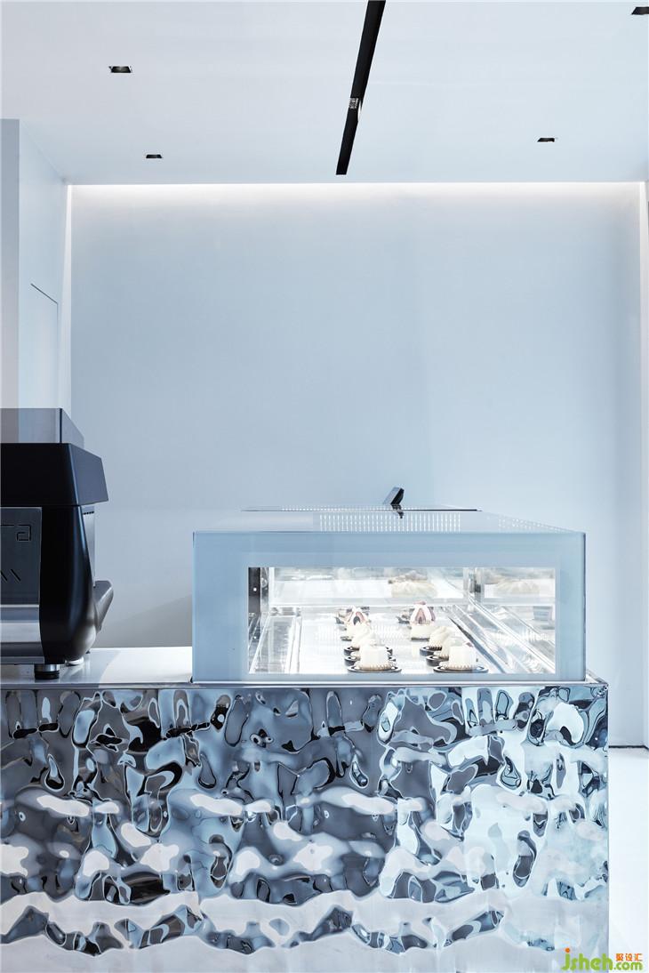 將這種前衛(wèi)個性進一步升華的,是柜臺處一面透著金屬質感的波浪板裝置,以流動的韻律和光影映射打破空間的沉寂,使之擁有大海的寬廣和深邃意象。對于食客,享用甜品的過程也就此轉化為味覺、視覺與想象力協(xié)同進行的一場互動展覽。