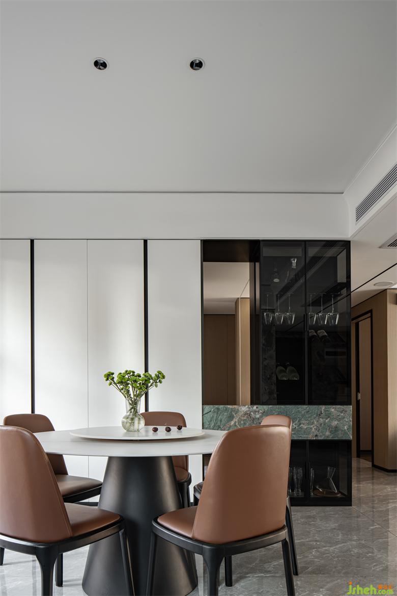 The designer cleverly set up a window view next to the wine cabinet, allowing the air to circulate naturally in the more open space. A green plant has become a bridge between the two spaces, and once the line of sight stops for a short time, there will be surprises. The refreshing green on the slate has become a solidified life memory.