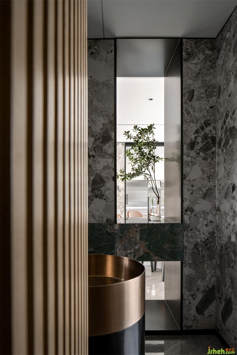 臺(tái)盆與其他功能的區(qū)域隔離,充分考慮了不同生活場(chǎng)景下的便利與實(shí)用。既保證了洗漱臺(tái)的潔凈干爽,室內(nèi)設(shè)計(jì)師也使它獨(dú)立存在而不影響餐廳與客廳的使用。