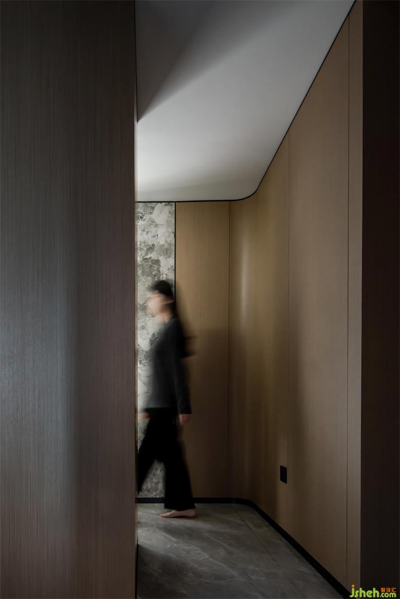 原木與巖板的交替使用,避免了空間感受的單一,室內(nèi)設計師在巖板的堅硬感與原木色彩的溫潤氣質(zhì)中繁復交迭,形成了極為豐富的空間層次。拐角的弧度巧妙地柔化著空間轉(zhuǎn)折的硬朗感,讓生活的每一個角落,都縈繞著舒適、自然、溫暖、和諧的氣息。