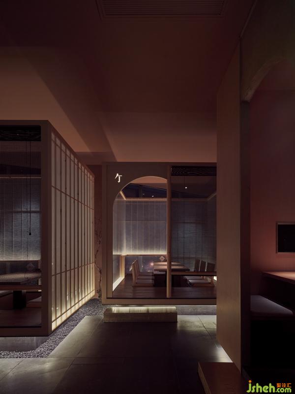 小廂是濃縮的傳統(tǒng)日本數(shù)寄居建筑:平整的離地平臺(tái),由走廊聯(lián)結(jié),踏步,地臺(tái),障子門結(jié)構(gòu)??臻T窗,暖簾,用夾絲玻璃替代宣紙的障子門,營(yíng)造了三種聯(lián)結(jié)外界的對(duì)話尺度。有趣的是,對(duì)話的比重也有被設(shè)計(jì),大面積的夾絲玻璃安全地聯(lián)結(jié)店外,半透的暖簾可以看到一個(gè)身影,直截的空窗,僅能看見(jiàn)或急或緩的腳步。室內(nèi)設(shè)計(jì)師在純粹的就餐空間中,坐姿正襟的食客也能找到富余變化的視覺(jué)樂(lè)趣,有所選擇,將視線停留在樂(lè)意處。每個(gè)廂相互獨(dú)立,避免平臺(tái)共振的打擾。障子門間、地臺(tái)間的空隙,成為氣流的良好通道,保證餐廳的空氣內(nèi)部循環(huán),新風(fēng)系統(tǒng)帶來(lái)的新鮮空氣由頂部入,濁氣沿著底部通道排出。常見(jiàn)于“枯山水”中的沙石造景,更增加了餐廳場(chǎng)景的庭院感,有了延伸至日式庭院的想象空間。