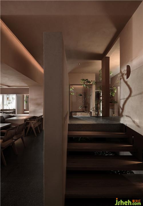 移步廊間,溫潤的木質(zhì)臺階與質(zhì)樸的大理石互相補(bǔ)充,透過間隙的光影打在墻上,空氣中流動的似有若無的清新自然,增添了餐廳場景的庭院感,溫暖明朗,無限想象。