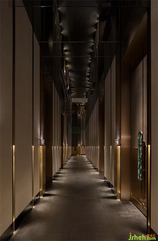 局部展露的服務(wù)臺(tái)暗示了下一個(gè)空間,形體由金屬塑造包裹的墻壁,完成“形”與“間”虛實(shí)轉(zhuǎn)換,自然過(guò)渡。從接待廳行進(jìn)至包廂走廊,依然由三個(gè)空間組成,循序漸進(jìn),空間尺度依次遞減,照度逐步降低,旋律漸漸平緩,遠(yuǎn)離喧囂,回歸寧?kù)o。