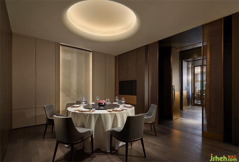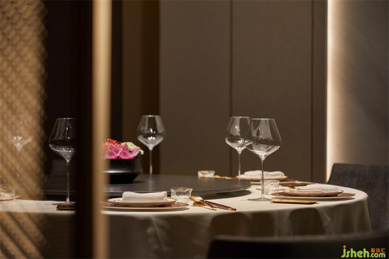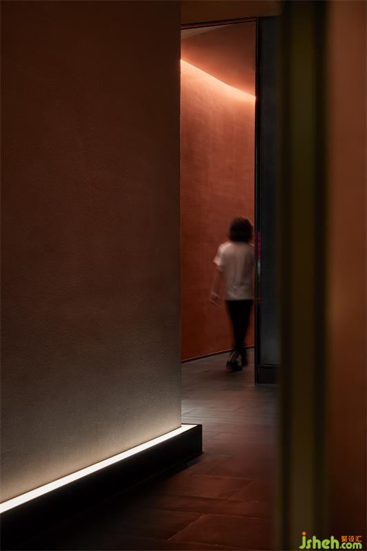 隱秘的美感得益于燈光的設(shè)計(jì),突出重點(diǎn)照明的方式,就餐區(qū)最亮,休息區(qū)次之,其他區(qū)域依次遞減來(lái)豐富空間層次,增加空間深度,且穿插部分線性洗墻的方式營(yíng)造氛圍,提升空間延展性。入夜燈亮,空間被朦朧溫柔的光所籠罩,就餐的輕盈感和氛圍感呼之欲出。