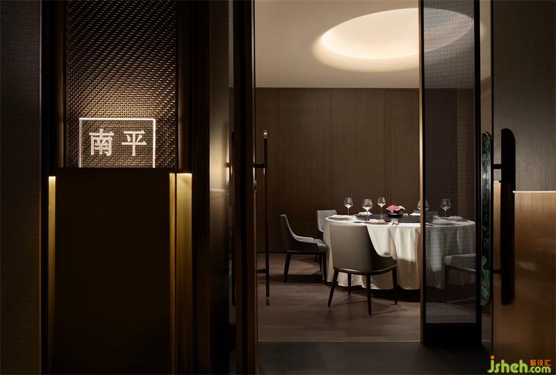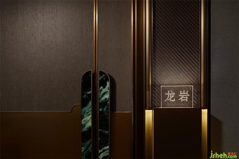 餐廳設(shè)計(jì)包廂門厚重大氣,提取福州門洞墻頭的獨(dú)特形態(tài),精選綠色花紋石材的門拉手呼應(yīng)綠色門拱的配色,同時(shí)與空間的紅色形成鮮明對(duì)比,襯得尤為典雅精致。一側(cè)門戶主題燈牌點(diǎn)亮,設(shè)計(jì)大小分明,透明玻璃與精致的磨砂雕刻碰撞,加以三坊七巷門牌的現(xiàn)代形式,營(yíng)造出大隱于市的府邸感受。