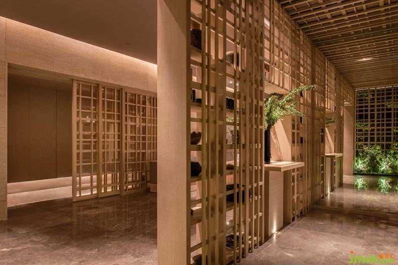 通往SPA區(qū)的廊道與前廳用4扇自動木格柵門連接,走廊墻壁上燭火搖曳,似有風(fēng)從盡頭而來,柔和的燈光穿過寬窄不一的木格柵,光影交錯,讓人一眼望不真切。