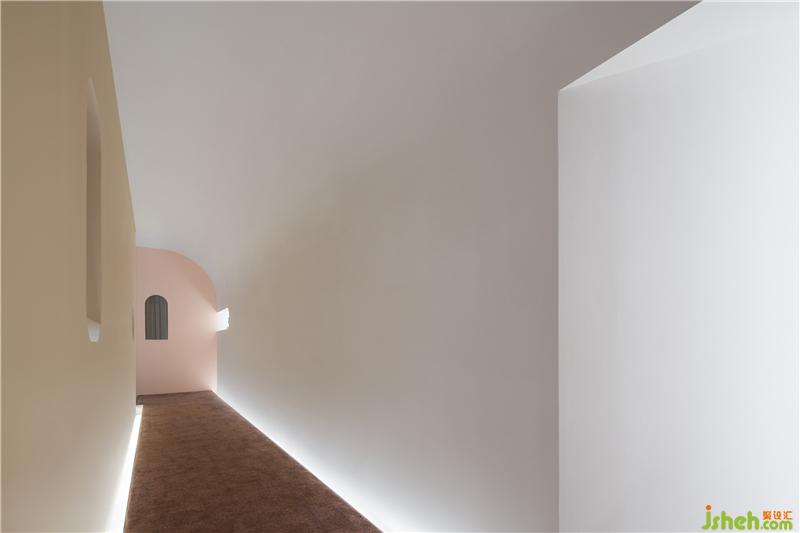穿過拱形門洞,接待臺后側(cè)是水吧與休息區(qū)以及兒童娛樂區(qū),我們希望這里除了休息、接待功能之外,也是一個可以滿足兒童娛樂的區(qū)域,讓家長、小孩在此能各取所需。