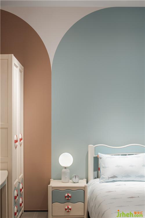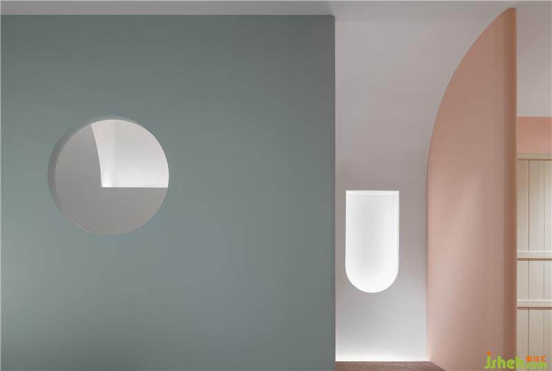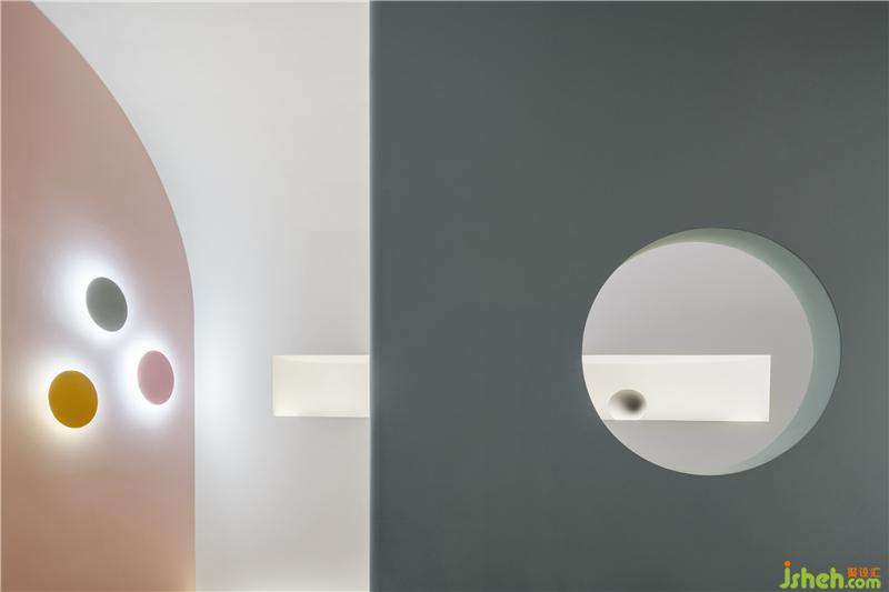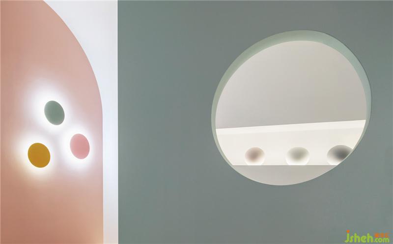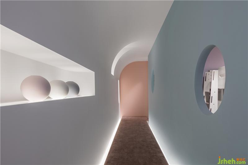 穿過時(shí)光廊便是彩色家具展區(qū),產(chǎn)品顏色或粉或藍(lán)或綠,色彩繽紛,于是墻身選用了雪青灰做底襯。