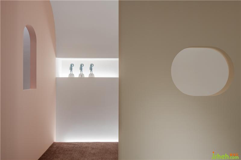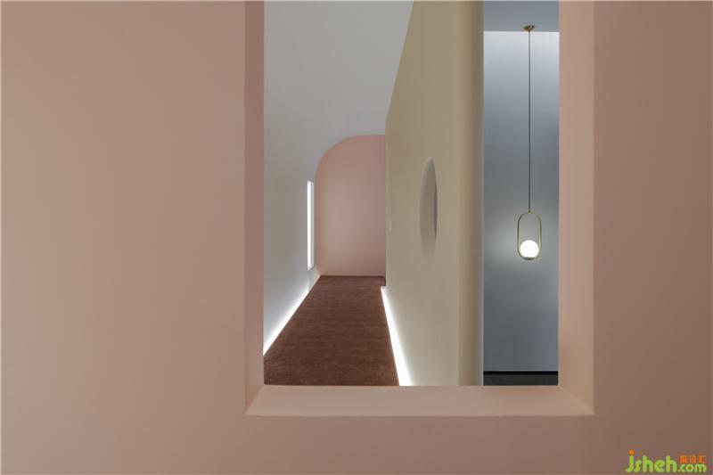 踏上廊道,讓人對(duì)下一個(gè)展示區(qū)充滿期待,它的底打光直至半弧的天花,柔和而夢幻,行走的途中可以在窗口回望、招呼,讓人與人、人與空間互動(dòng),家具展廳設(shè)計(jì)空間變得更有趣了。