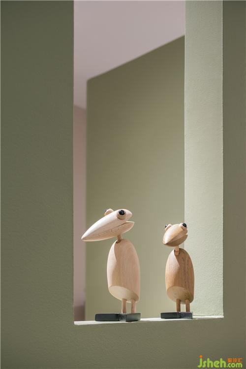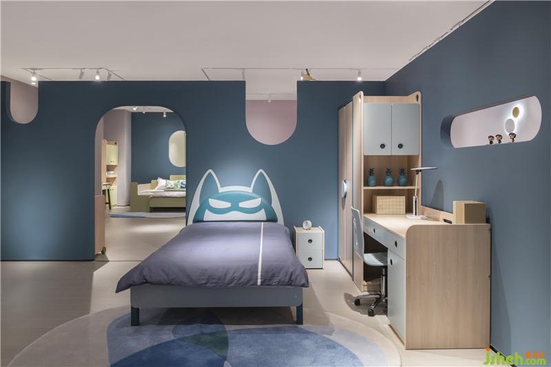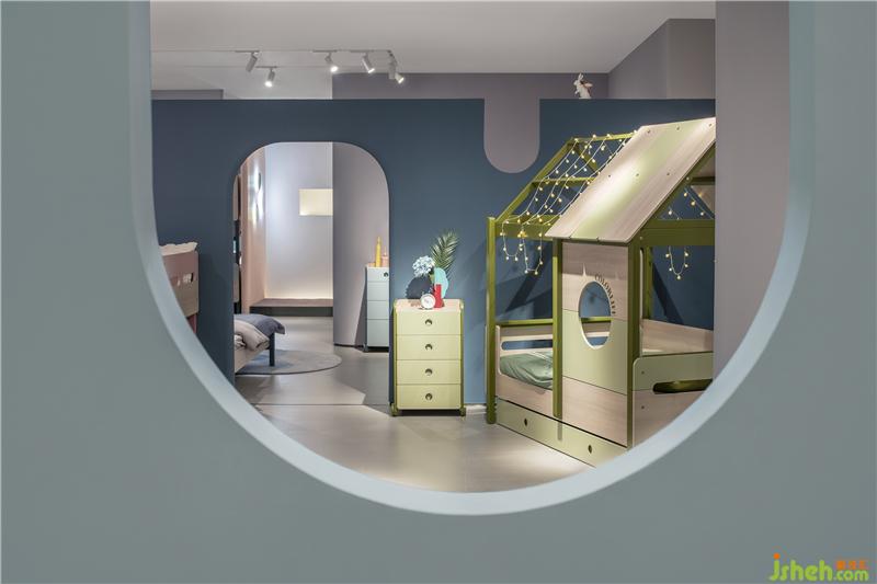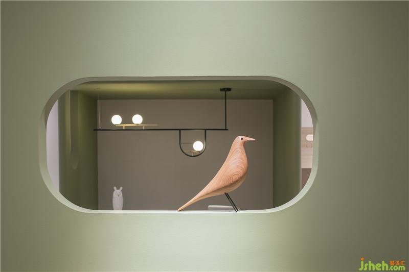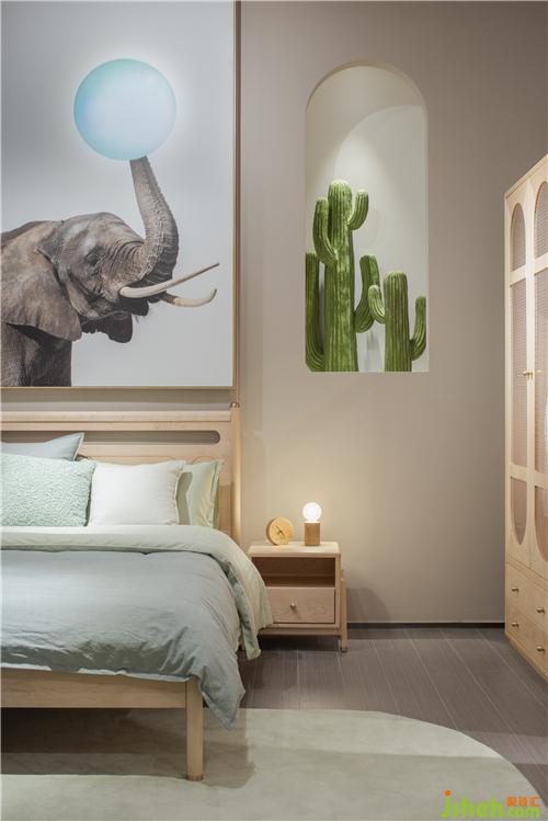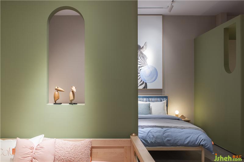 穿過床墊區(qū)可見一柔和氛圍,這便是原木家具展區(qū),原木有著天然的親和力與溫潤的質(zhì)感,墻身選用象牙色讓空間變得安靜,枯綠色的雕塑墻豐富了空間層次,配上俏皮可愛的動物畫、動物小木偶,家具展廳設計讓寧靜而輕松的空間氛圍添了幾分童趣。